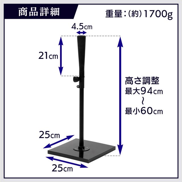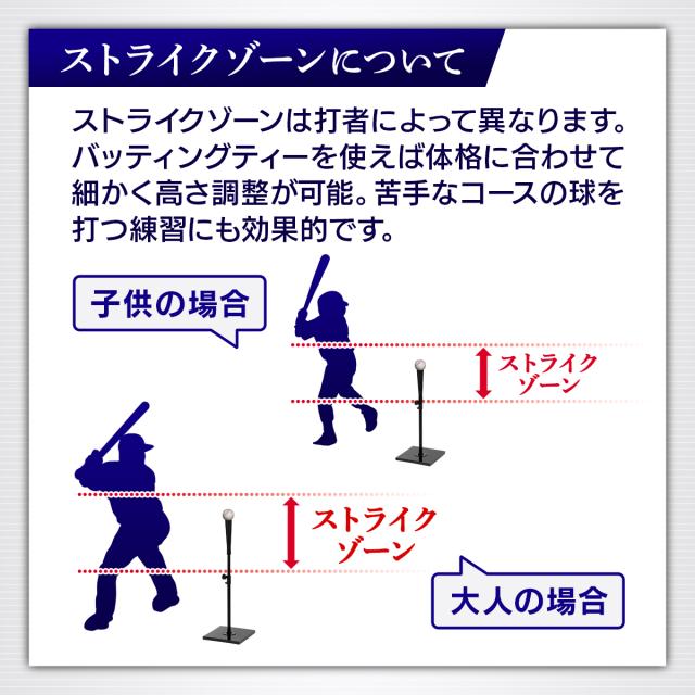 【最小60cm〜最大94cmまで調整できる】身長やストライクゾーン、苦手なコースなど、使う人に合わせて細かく高さ調整が可能!お子様から大人まで、手軽に自主練習ができるバッティングティーになります。