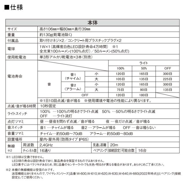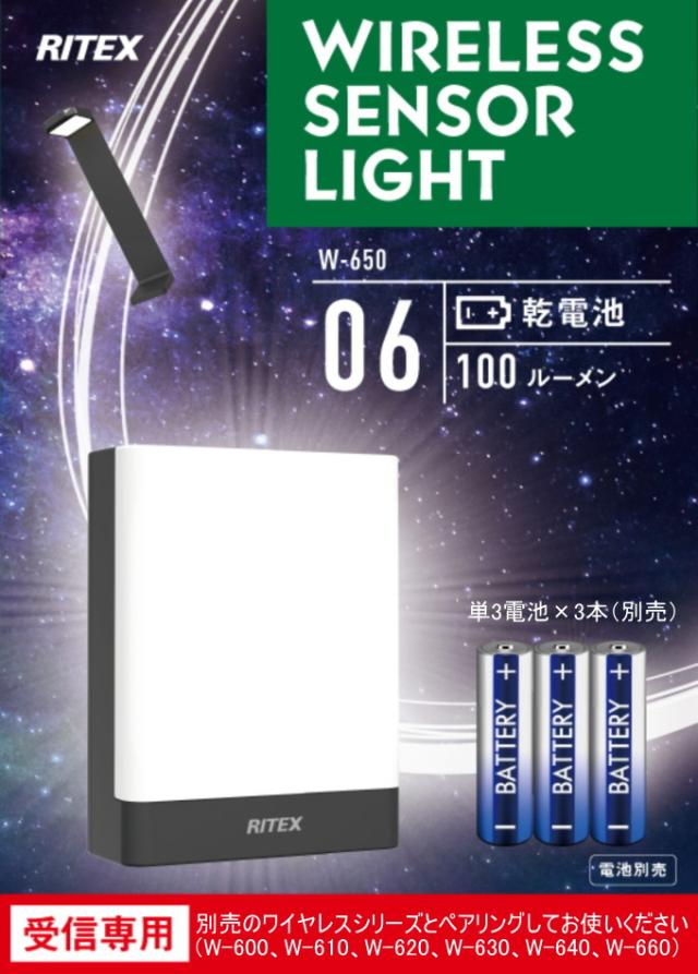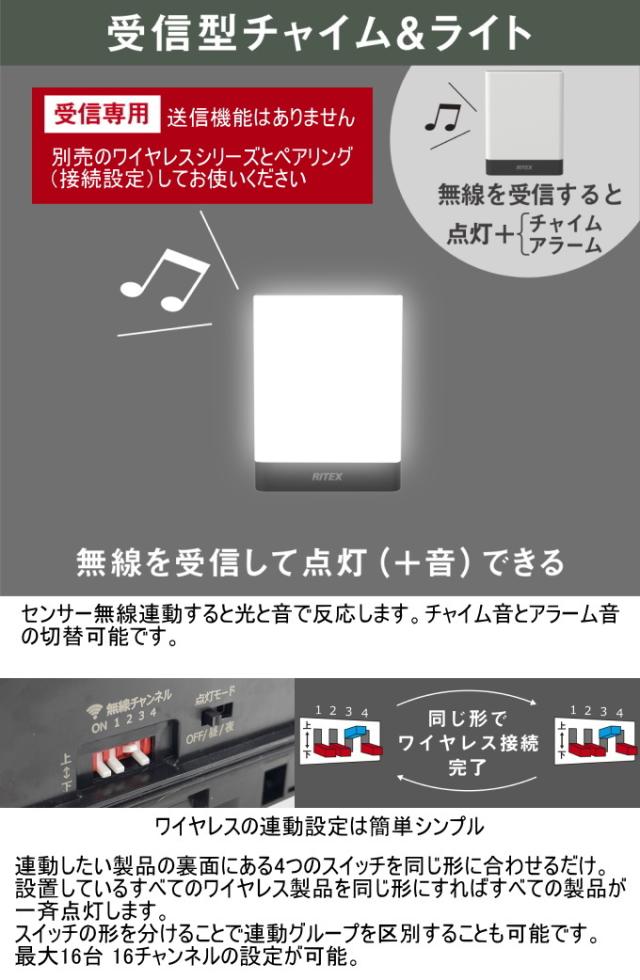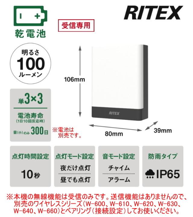 乾電池式 無線連動チャイム&ライト 受信型 W-650 送料無料 受信専用 受信 LED アラーム 自動点灯 防雨型 RITEX