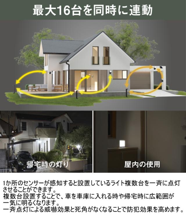 無線連動で一斉点灯!ワイヤレスセンサーライトシリーズ。 1か所のセンサーが感知すると設置しているライト複数台を一斉に点灯させることができます。 複数台設置することで、車を車庫に入れる時や帰宅時に広範囲が一気に明るくなります。 一斉点灯による威嚇効果と死角がなくなることで防犯効果を高めます。 ワイヤレスの連動設定は簡単シンプル。 連動したい製品の4つのスイッチを同じ形に合わせるだけです。 設置しているすべてのワイヤレス製品を同じ形にすればすべての製品が一斉点灯します。 スイッチの形を分けることで連動グループを区別することも可能です。(最大16台16チャンネル) W-650はセンサー無線連動すると光と音で反応します。 チャイム音とアラーム音の切替可能です。 乾電池式で設置場所を選びません。 ※W-650は受信専用です。送信機とセットでお使いください。 |