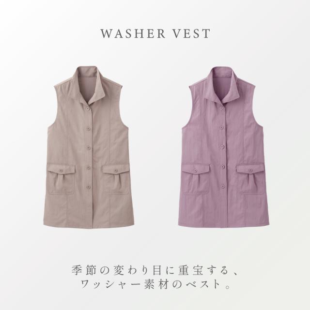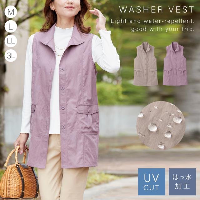 生地にははっ水加工、UVカット機能を備えた快適なベスト。ワッシャー素材で柔らかなシワ感があり持ち運びにも便利です。