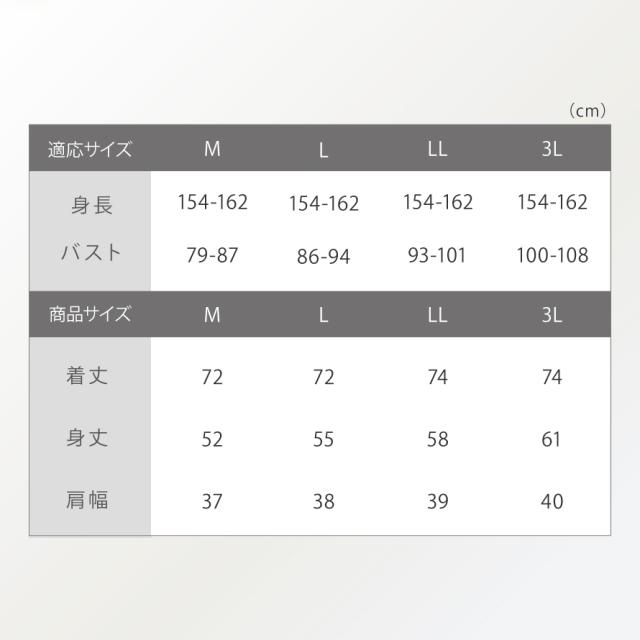■サイズ:身長154-162、M/バスト79-87、着丈72、身丈52、肩幅37、L/バスト86-94、着丈72、身丈55、肩幅38、LL/バスト93-101、着丈74、身丈58、肩幅39、3L/バスト100-108、着丈74、身丈61、肩幅40cm