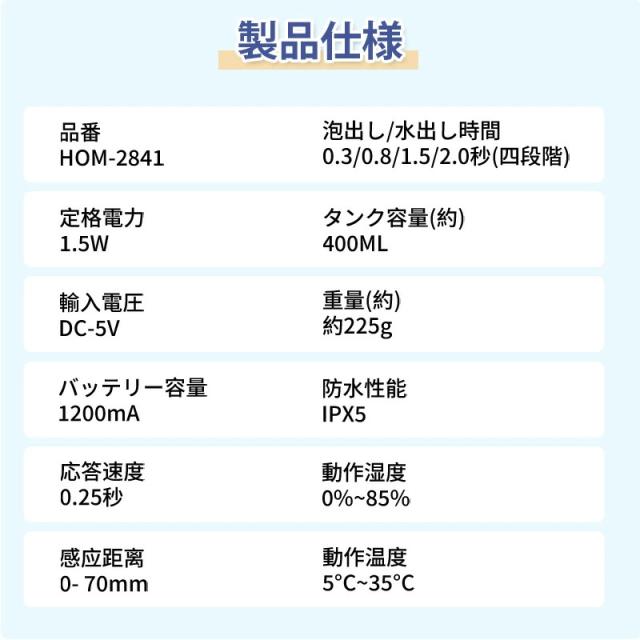 | Q: このソープディスペンサーの主な特徴は何ですか? A: 非接触式のデザインで、感知距離最大7cm。400mlの大容量と4段階の吐出量調整が可能で、充電式で防水仕様です。 Q: 吐出量の調整はどのように行いますか? A: 4段階の吐出量設定が可能で、必要な量を簡単に調整でき、手洗い液の無駄を防ぎます。 Q: このソープディスペンサーの防水性能はどの程度ですか? A: IPX5防水仕様で、浴室などの湿気の多い場所でも安心して使用できます。 Q: 1回の充電でどれくらい使用できますか? A: 400mlのタンク容量で約500回使用可能。頻繁な補充が不要で、長期間の利用に便利です。 Q: このディスペンサーはどのような材質で作られていますか? A: ABSとPP材質で作られており、耐久性に優れ、長く使用できる設計です。 Q: 設置方法はどのようになっていますか? A: 壁掛けフックが付属しており、簡単に壁に取り付けて省スペースで使用できます。 | ||||||