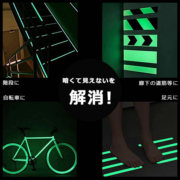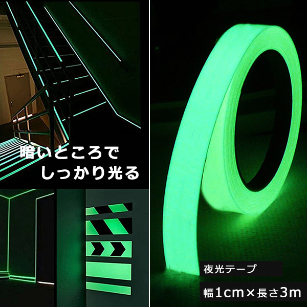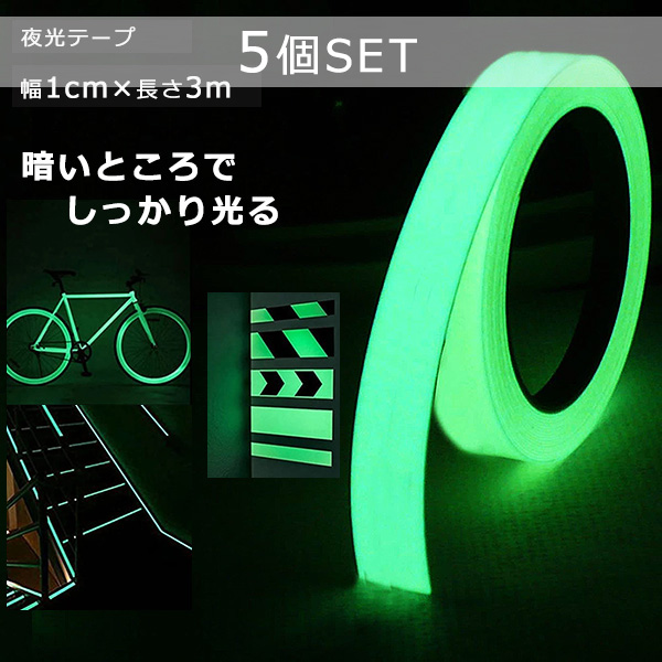 夜光テープ 幅1cm×3m 5本SET 蓄光テープ 高輝度 防水 防滴 蛍光テープ 夜光シール 光る テープ 階段 スイッチ 壁 非常口 出口 標識 防災対策 自転車 事故防止 夜釣り 防犯 ドアノブ インテリア