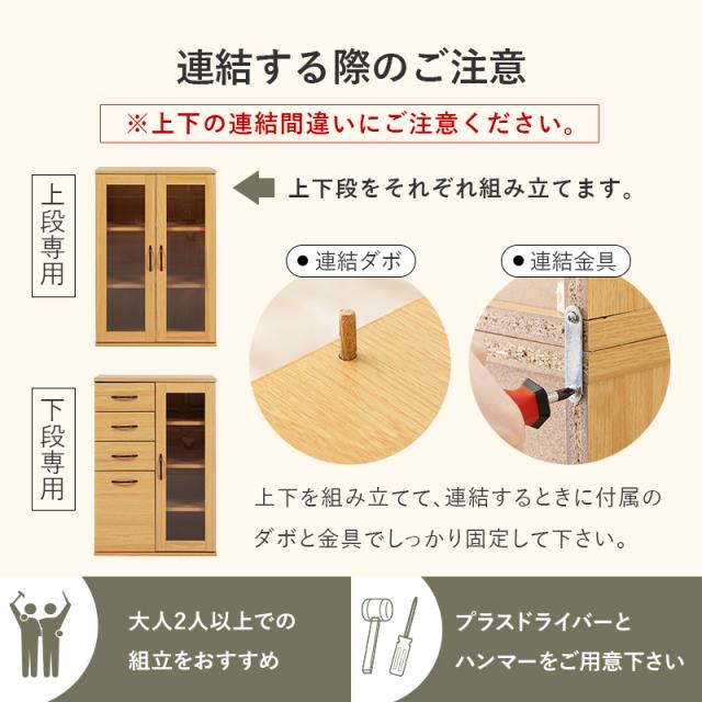上段のガラス扉収納は、横幅のある食器や鍋などの収納にぴったりです。