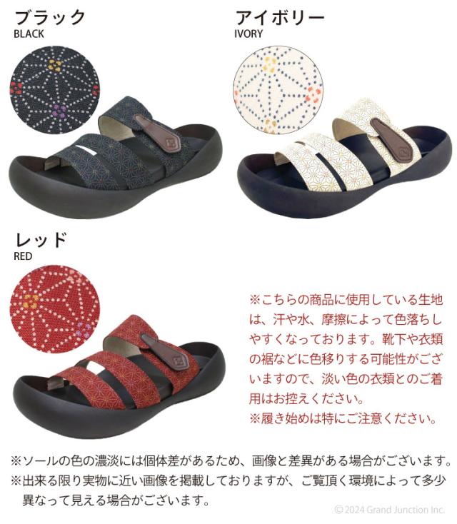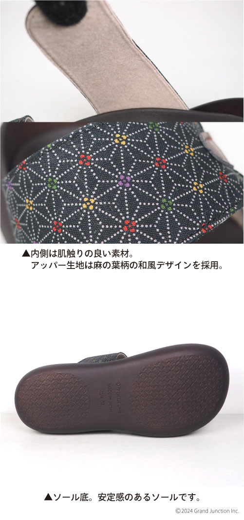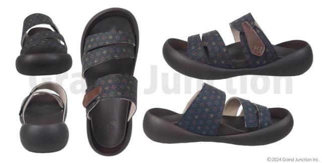 和柄の中でも定番人気の「麻の葉」模様のサンダルです。 浴衣などに合わせやすく、爽やかに足元を飾ります。 中央のベルトの端はゴムで切り替えられ、足首側のベルトはベルクロでサイズ調整が可能なので、幅広、甲高の方にもおすすめです。
