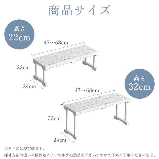 伸縮棚 積み重ね 幅 47-68cm 高さ 22cm 32cm 奥行 24cm 伸縮ラック クローゼット 押入れ 通気性 収納 防水 丈夫 頑丈 整理棚 シンク下 ワイド 空間活用 省スペース キッチンラック 空きスペース 隙間 新生活 すき間 衣替え スリム 長さ調整 押し入れ キッチン 玄関 脱衣所