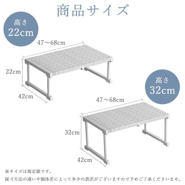 伸縮棚 積み重ね 幅 47-68cm 高さ 22cm 32cm 奥行 42cm 伸縮ラック クローゼット 押入れ 通気性 収納 防水 丈夫 頑丈 整理棚 シンク下 ワイド 空間活用 省スペース キッチンラック 空きスペース 隙間 新生活 すき間 衣替え スリム 長さ調整 押し入れ キッチン 玄関 脱衣所