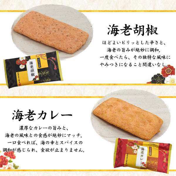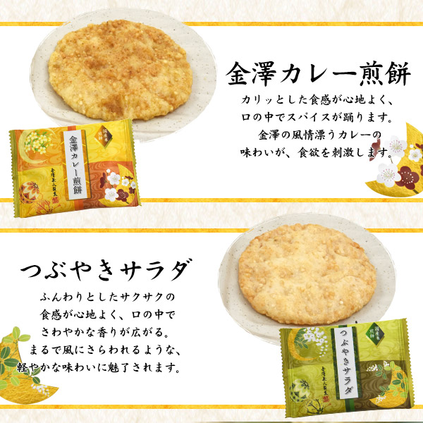 【内容量】計57枚(海老カレー煎餅×14枚、黒ごま入り玄米煎餅×14枚、えびまめ花煎餅×10枚海老胡椒煎餅×9枚、つぶやきサラダ煎餅×5枚、金澤カレー煎餅×5枚)