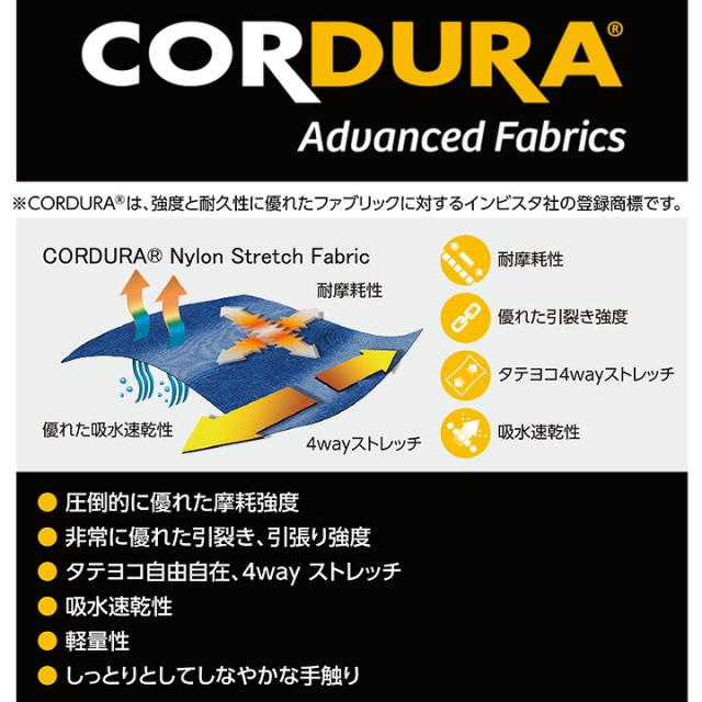 ●耐久性と自在に伸縮する4WAYストレッチの特性を有するハードユースに最適なコーデュラ素材を使用