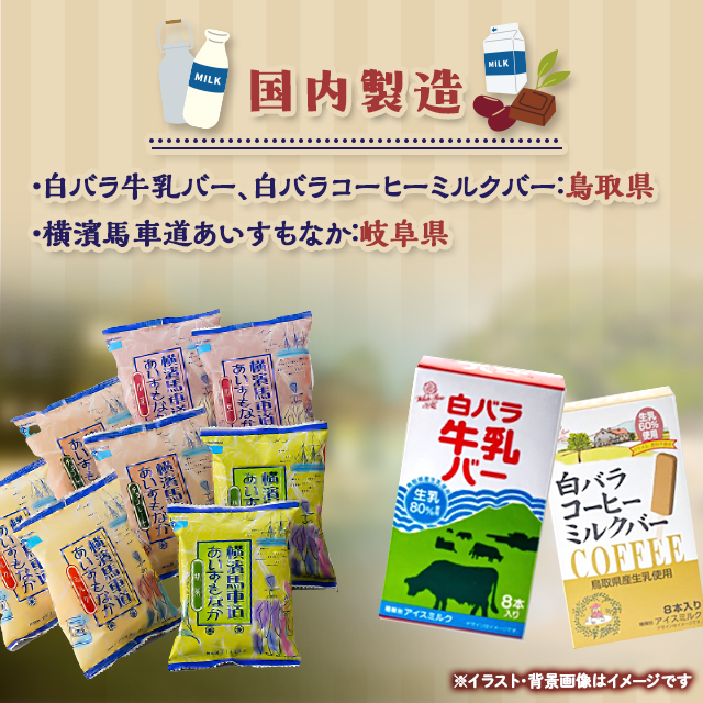 【白バラコーヒーミルクバー】生乳(鳥取県)、砂糖、水あめ、乳製品、コーンスターチ、コーヒー、(一部に乳成分を含む)