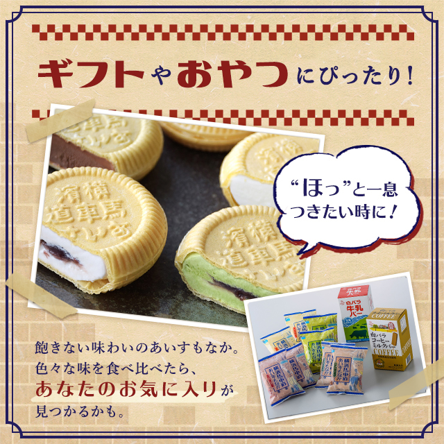 【横濱馬車道あいすもなか(ミルク・抹茶・小豆・チョコレート)】