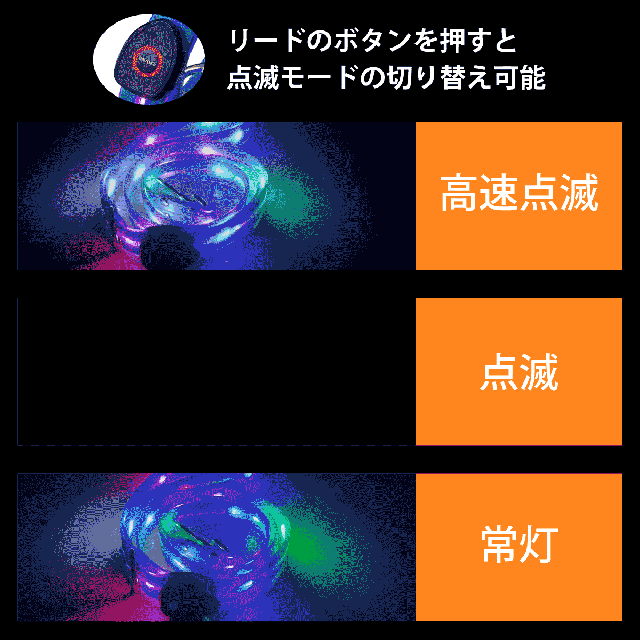 LEDライトを使用しており、瞬時に明るく。高速点滅・点滅・常灯を切り替えられます。