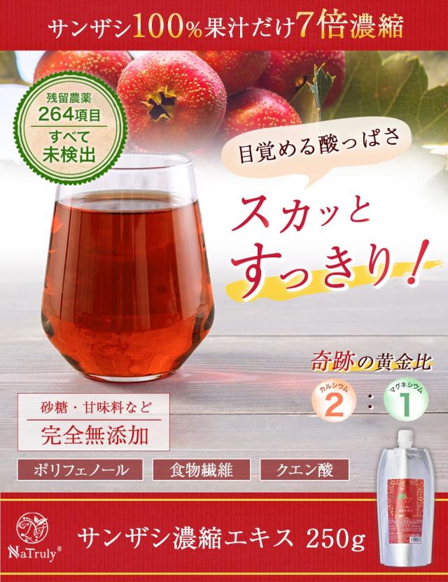 | 使用方法 | ●大さじ1杯程度(約20g)をお好みに合わせて5〜10倍に薄めてお召し上がりください。薄めず、そのままソースとしてお料理やお菓子作りにもご利用いただけます。 ●1日あたりの目安:約20g〜40g(大さじ1〜2杯程度) ●沈殿物や浮遊物も大切な成分ですので、よく振ってからお召し上がりください。 ※天然由来のため、収穫時期や商品ごとに色、味、香りにバラつきが生じることがございますが、品質には問題ございません。 ※なるべく空腹時を避け、胃腸がご心配な場合は食後、十分に希釈してご利用いただくことをおすすめします。 ※サンザシ:妊娠中はデリケートな時期ですので、ご利用をお控えください。 |