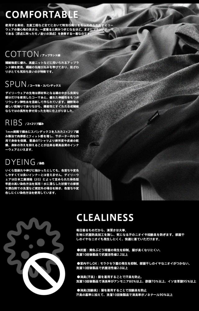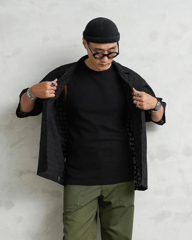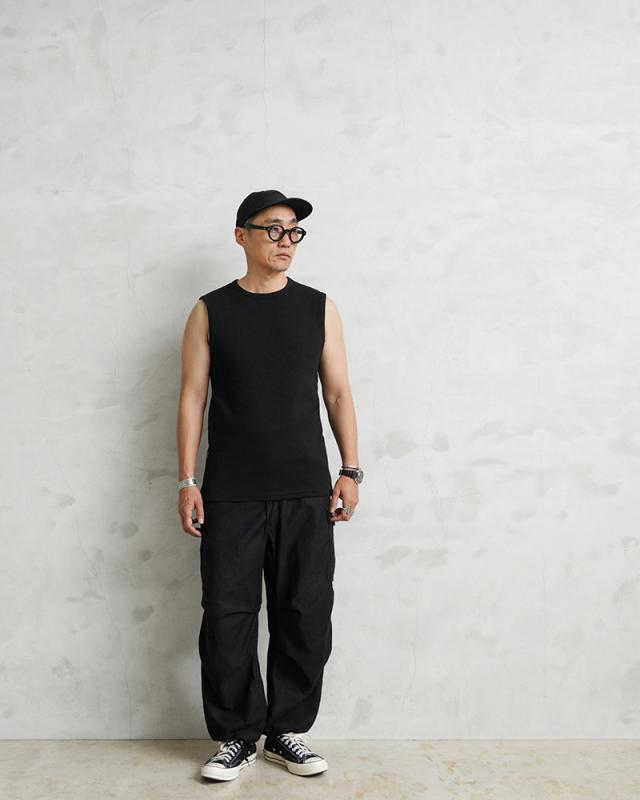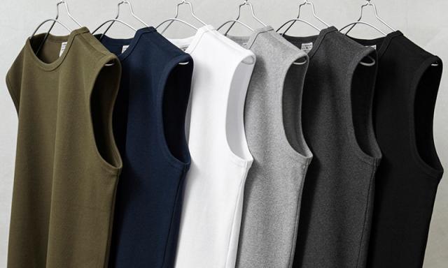ノースリーブデザインにややゆったりめのシルエット、スッキリとした肩周りはインナーとして重宝するデザイン。テンションの強いライクラ糸を入れたリブ編み素材なのでしっかりした風合いに、優れた耐久性がヘビーローテーションでの着用にも耐えるアイテムです。