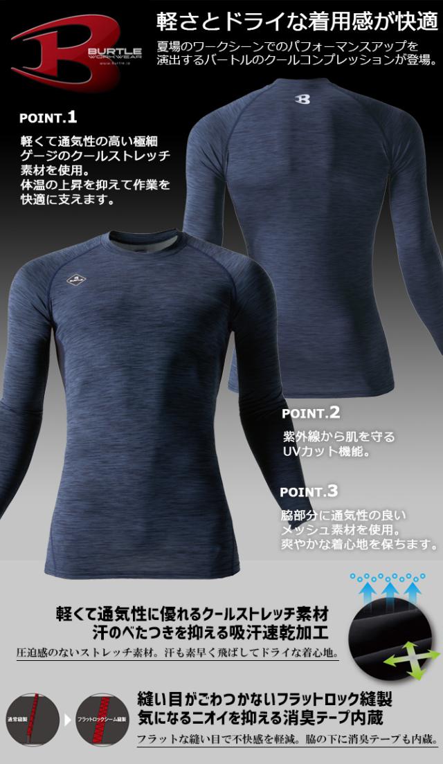 1点までネコポス可 バートル クールコンプレッション エアーフィット 長袖 BURTLE 4070 夏用 メンズ レディース 春夏用 接触冷感 吸汗速乾 消臭テープ UVカット スーパーストレッチ 作業服 作業着