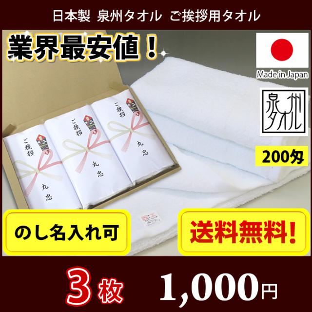 【送料無料】小口 3枚セット 引っ越し ご挨拶用タオル(のし紙名入れ) 日本製 泉州タオル 白 200匁 フェイスタオル