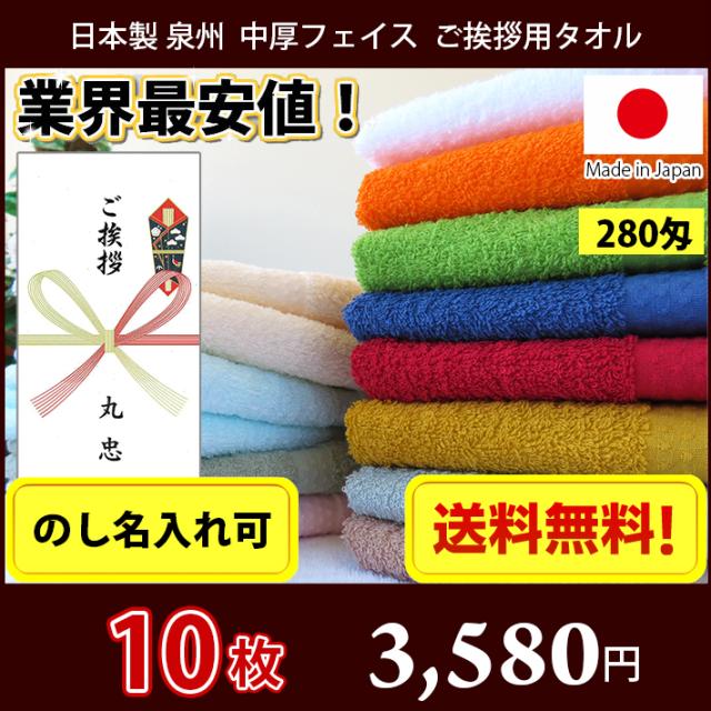 【送料無料】小口 10枚セット 引っ越し ご挨拶用タオル(のし紙名入れ) 日本製 泉州 中厚 シンプル 280匁 フェイスタオル 宅急便