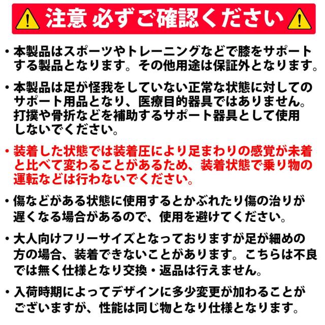 ・本製品はスポーツやトレーニングなどで膝をサポートする製品となります。その他用途は保証外となります。