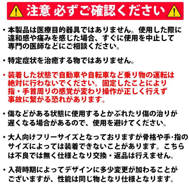 ・装着した状態で自動車や自転車など乗り物の運転は絶対に行わないでください。固定したことにより指・手首周りの感覚が変わり操作が正しく行えず事故に繋がる恐れがあります。