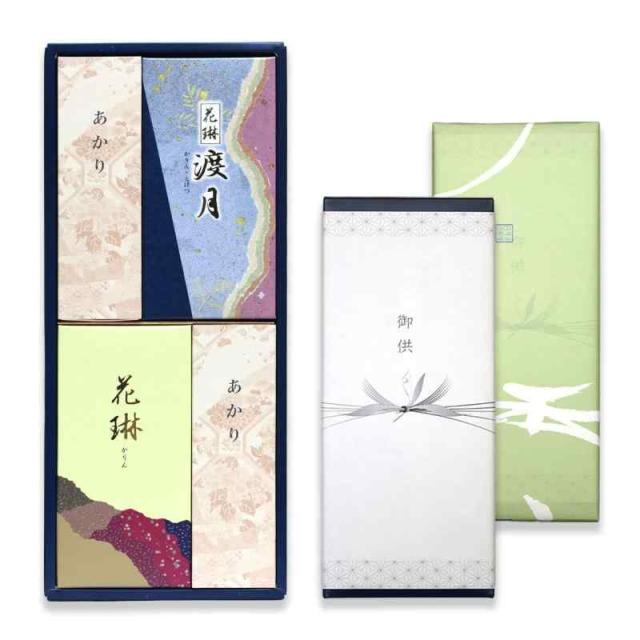 商品構成 ・花琳・渡月2種×各1箱 ・ロウソク(小箱入り) ・ギフト仕様の紙箱 ・線香の長さ:約13.5cm ・燃焼時間:約25分
