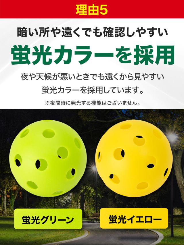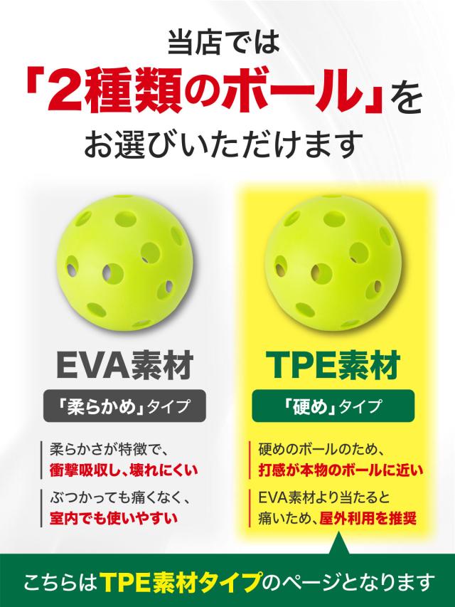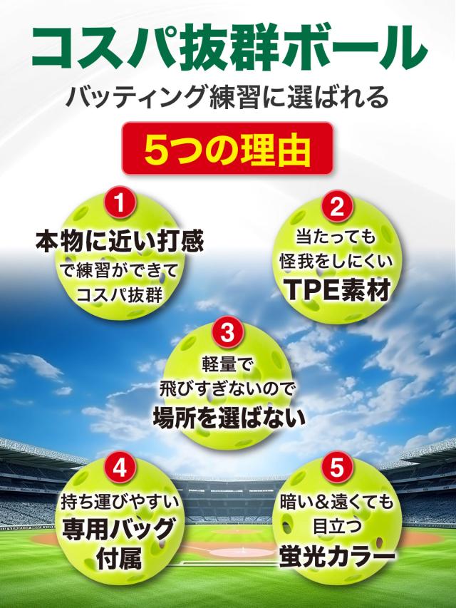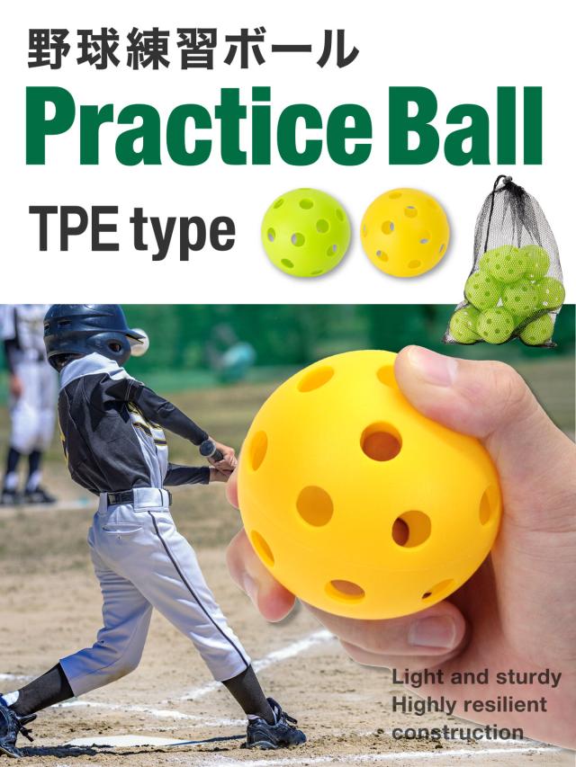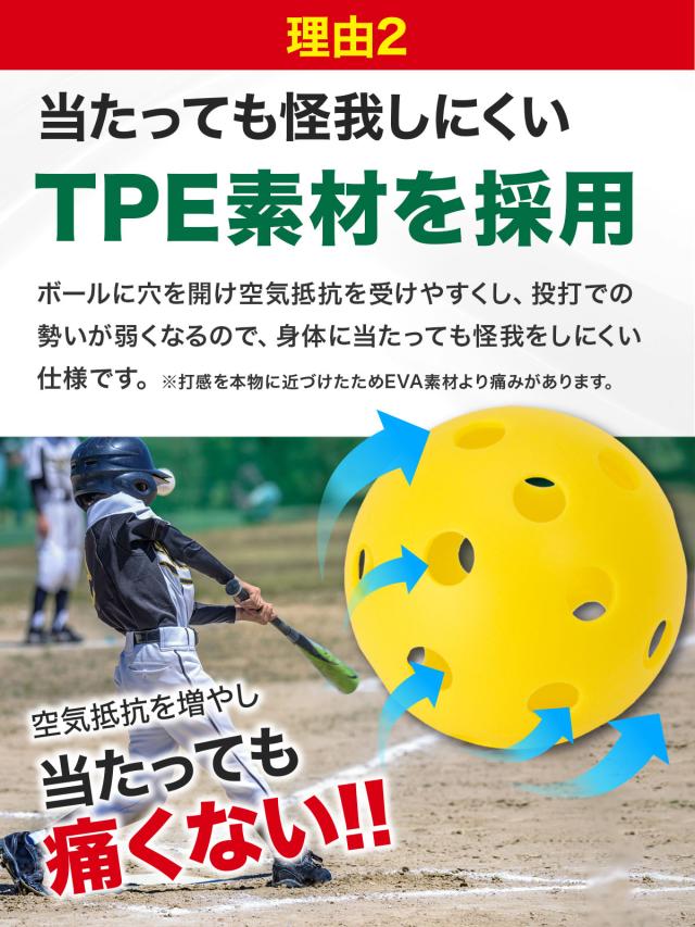 【当たっても怪我をしにくい素材】野球ボールだと重くスピードも出てしまうので、周りの物や人に当たると大変なことに。TPE素材は軽いので飛びづらく、穴を開け空気抵抗を増やすことで勢いが弱まり、万が一当たってしまっても怪我をしにくい仕様となっております。