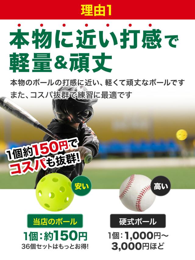 【本物のボールの代わりとして】きちんとした野球ボールを揃えるとなると結構な出費になりますよね。こちらのTPE素材の練習用ボールなら本物のボールに近い打感で練習することが出来るのに、1個約150円と硬式ボールの2割以下の価格を実現。練習に最適なコスパ抜群のボールになります。