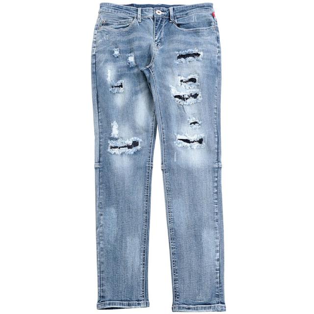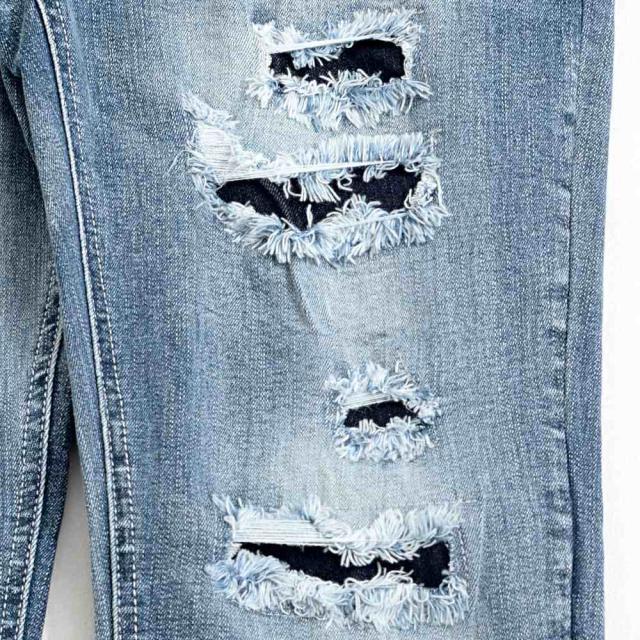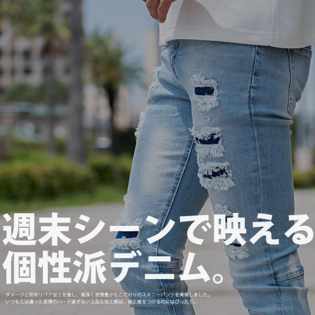 ダメージと別布リペア加工を施し、奥深く表情豊かなこだわりのスキニーパン