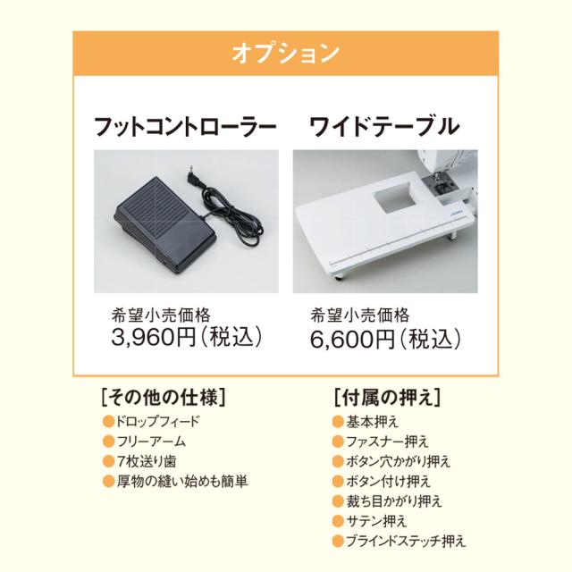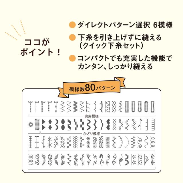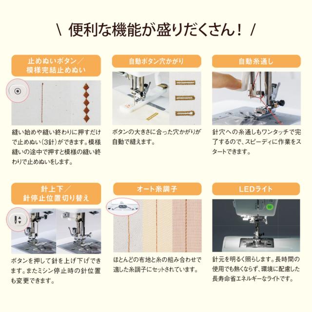 スタート/ストップボタン、クイック下糸セット、押え圧の調節、模様のサイズ変更/針基線位置変更、止縫いボタン/模様完結止め縫い、自動ボタン穴かがり、自動糸通し、針上下/針停止位置切替、オート糸調子、LEDライト、ドロップフィード、フリーアーム、7枚送り歯、模様数80パターン