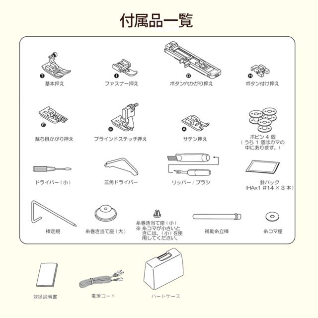 基本押さえ、ファスナー押え、ボタン穴かがり押え、ボタン付け押え、裁ち目かがり押え、ブラインドステッチ押え、サテン押え、ボビン、ドライバー、三角ドライバー、リッパー/ブラシ、針パック、補助糸立棒、糸コマ座、取扱説明書、電源コード、ハードケース