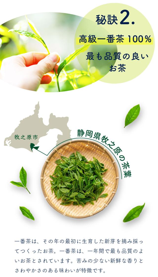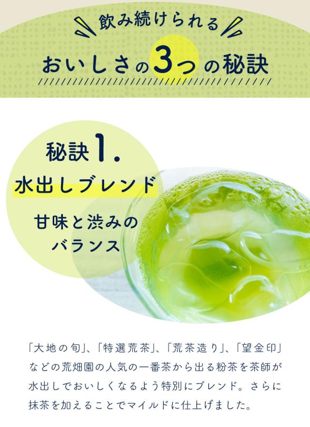 「大地の旬」、「特選荒茶」、「荒茶造り」、「望金印」などの荒畑園の人気の一番茶から出る粉茶を茶師が水出しでおいしくなるよう特別にブレンド。さらに抹茶を加えることでマイルドに仕上げました。