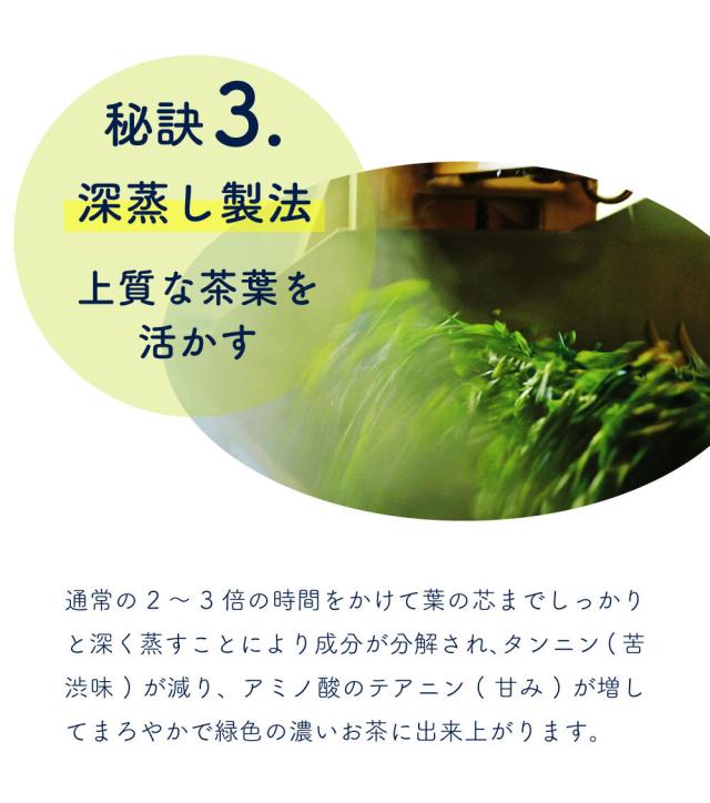 通常の2〜3倍の時間をかけて葉の芯までしっかりと深く蒸すことにより、成分が分解され、タンニン(苦渋味)が減り、アミノ酸のテアニン(甘み)が増してまろやかで緑色の濃いお茶に出来上がります。