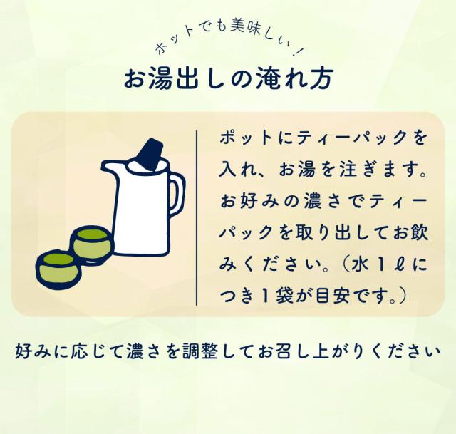 - この緑茶パックに水を注ぐだけで簡単に淹れられ、香り高くまろやかな味わいが楽しめます。ほどよい渋みとすっきりとした後味が絶妙に調和しており、夏の暑い日や食事のお供にピッタリです。