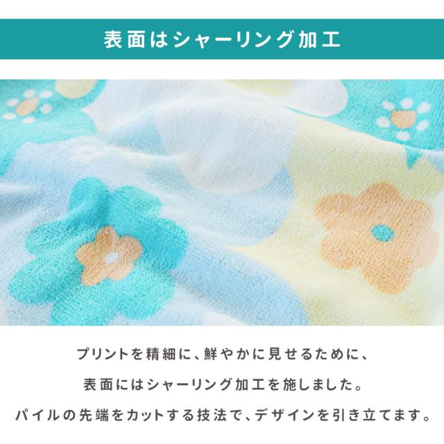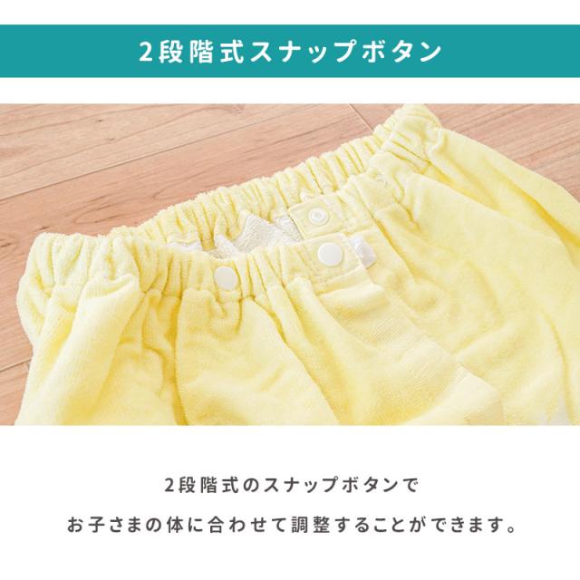 | ・表面はシャーリング加工 プリントを精細に、鮮やかに見せるために、表面にはシャーリング加工を施しました。パイルの先端をカットする技法で、デザインを引き立てます。 ・裏面はパイル生地裏面はパイル生地なので、タオルとして水分をしっかりふき取ってくれます。綿100%でお肌にやさしいのも嬉しいポイント。 ・2段階式スナップボタン2段階式のスナップボタンでお子さまの体に合わせて調整することができます。 | |