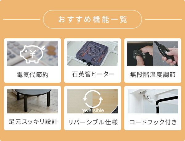 | 商品説明 | ●電源:100V (50Hz/60Hz) ●消費電力:300w ●ヒーター型番:MS-303H ●電気代目安(1時間あたり):(強)約5円、(弱)約2.5円 ※電気料金目安単価1kWhあたり31円/kWhで算出 ●電源コード:中間入切スイッチ ●電源コード長さ:3m ●日本国内トップメーカーの薄型石英管ヒーター使用 ●無段階温度調節 ●一人暮らしにピッタリな円形こたつ布団セット ●布団を外せばテーブルとして年中使用可能 ●メーカー保証:1年 |