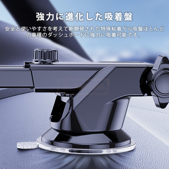 | 【強力ゲル吸盤&安定感満々】 | ◆アップグレード真空ゲル吸盤は耐荷重が最大25KG、従来型より30倍以上。 ◆レバーを押して吸盤内部が真空に作ってダッシュボード/フロントガラスにしっかり固定し、アームが揺れることもありません。 ◆更に、吸盤が汚れて吸引力が弱くなった場合でも、一度水洗いをして吸着力がすぐ回復します。 ◆非常に経済的で実用的なカー用品です。 |