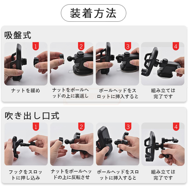 | 【1台2役スマホ車載ホルダー】 | ◆スマホスタンドは強力ゲル吸盤とエアコン吹き出し口クリップが付き、車内、オフィス、寝室、キッチンなど取り付けしたい位置に簡単装着できてご利用頂けます。 ◆超強力真空吸盤と三角構造を採用し、凸凹の悪路でもしっかり固定でき、スマホ落下の心配はありません!また、高品質のシリコンパッドを採用しており、摩擦・衝撃吸収性が10倍強化し、愛車とスマホを傷つけなません。 |