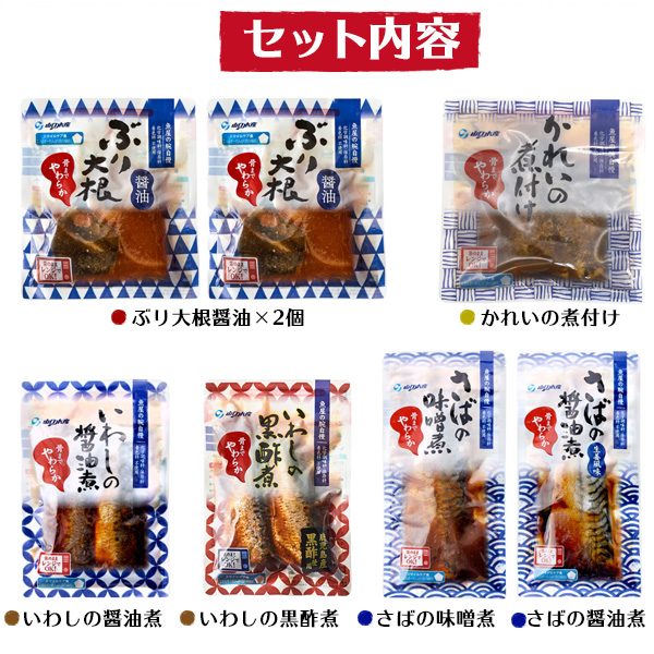 【セット内容】 ぶり大根醤油200g×2 /いわしの醤油煮150g/いわしの黒酢煮150g /さばの味噌煮100g/さばの醤油煮100gかれいの煮付け100g