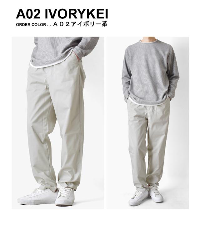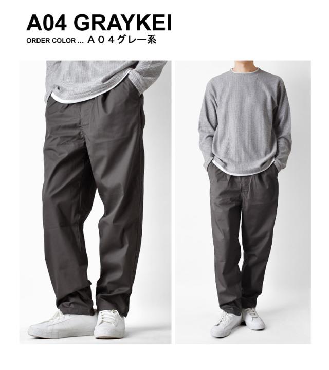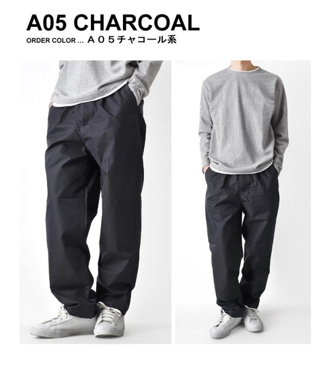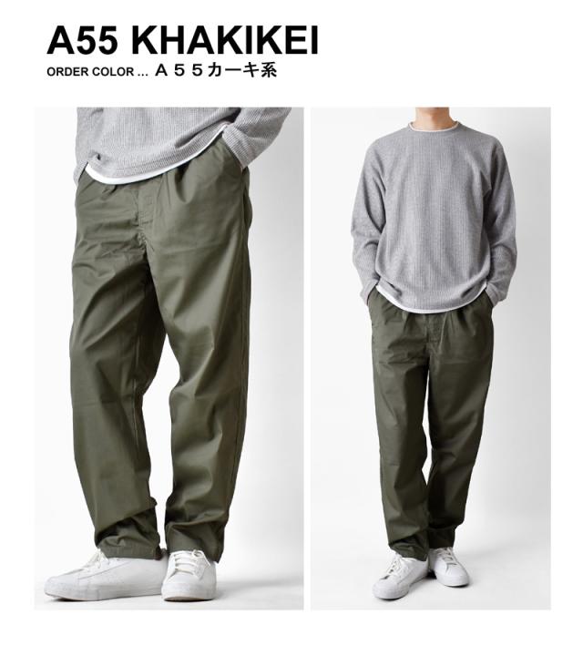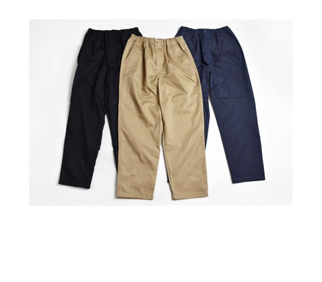 通常であれば焼却破棄される残反を活用し、新しく生まれ変わったチノパンツが登場。トレンドのワイドシルエットとテーパードラインをミックス。Tシャツやスウェットなどトップスとの相性も良く、ストリートスタイルにオススメのアイテムです。