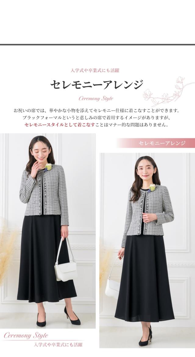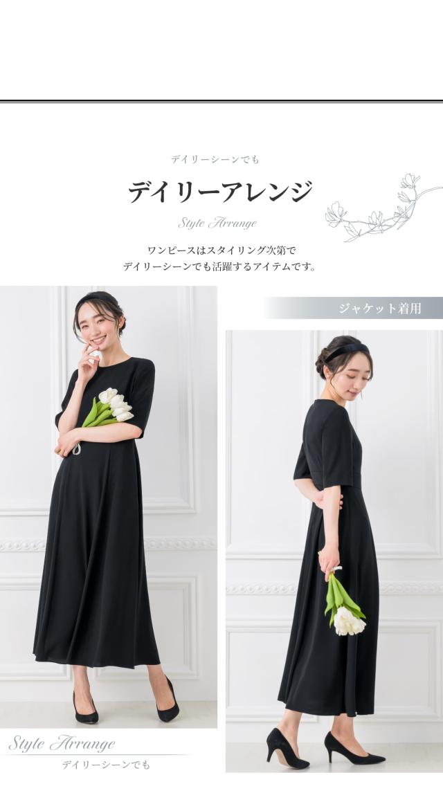 シンプルなカラーレスジャケットと美しいフレアシルエットのロングワンピースをセットにした上品なブラックフォーマル。