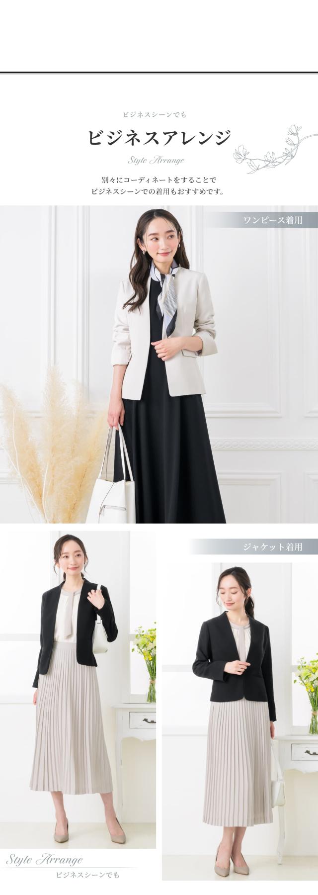 説明 | エレガントに纏う洗練されたブラックフォーマルスーツ。 シンプルなカラーレスジャケットと美しいフレアシルエットのロングワンピースをセットにした上品なブラックフォーマル。 ワンピースのデザインは3種類からお選びいただけます。 ジャケットはすっきりとしたシルエットでフロントを閉めても開きすぎないよう細部まで調整。 無駄のない洗練されたデザインが端正な印象を引き締めます。 ワンピースには程よい落ち感のある上質な素材を贅沢に使用し、動くたびにしなやかに揺れる美しいフレアシルエットを実現しました。 デザインAはたっぷりとした裾フレアが特徴で、歩くたびに優雅な動きを生み出します。 デザインBはフロントタックが控えめなアクセントとなり、落ち着きのある洗練された佇まいに。 デザインCはリラクシーな着心地ながらも、ほどよく引き締まったシルエットでスタイルアップを叶えます。 どのデザインも二の腕や下半身を自然にカバーし、すっきりと見せてくれるのも嬉しいポイント。 セットでの着用はもちろん、それぞれ単品でも活躍。 お通夜や法要などの厳かな場面にはもちろん、通勤やデイリーシーン、パーティーや入学式などフォーマルなシーンにも対応し、シーンを選ばず着回せる優秀な一着です。 ワンピースの上身頃には、さらりとした風合いのサップ裏地を使用し、肌に優しく快適な着心地に。 スカート部分には美しいシルエットを保つ滑らかなタフタ裏地を採用しました。 さらに、ご家庭で洗濯ができるためいつでも清潔に保てるのも魅力。 端正な佇まいと着心地のよさを兼ね備えた上品なブラックフォーマル。 大人の女性にふさわしい気品あふれる一着です。 |