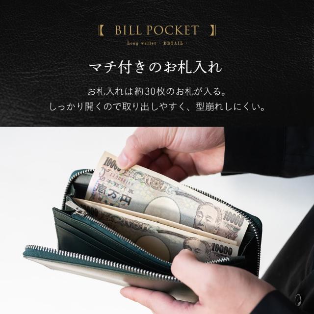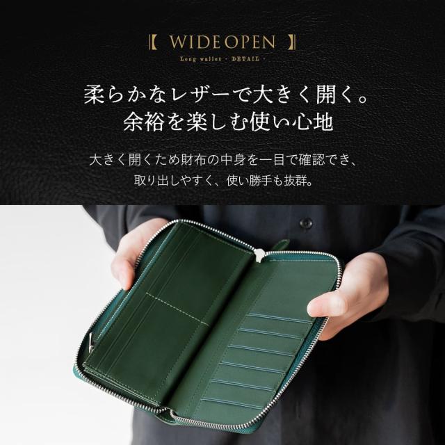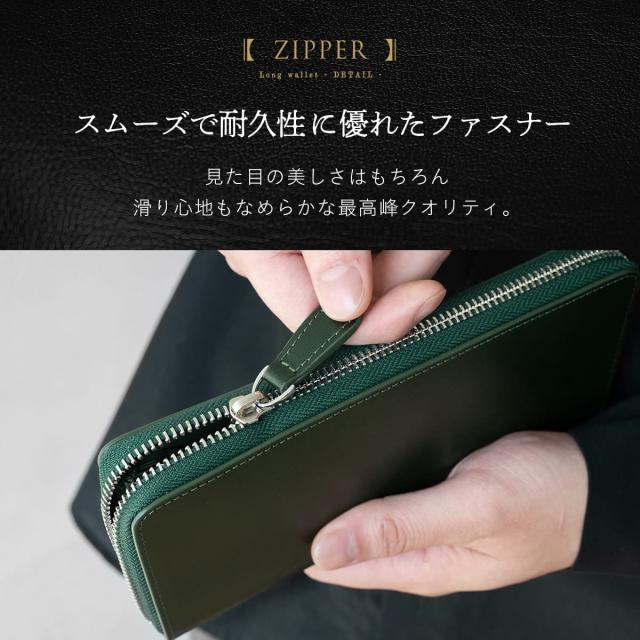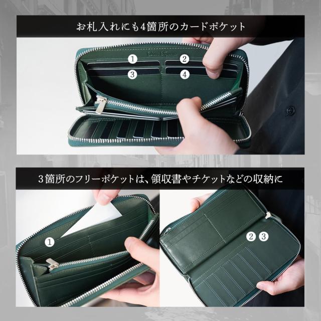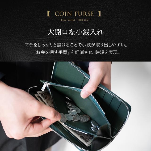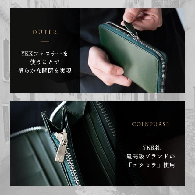 ラウンドファスナーを開くとひと目で見渡せる大容量カードポケット。お札入れと小銭入れにマチを付け、取り出しやすさと薄さを両立。ファスナーは全てYKK製。小銭入れ部分にはYKKの最高級ラインEXCELLAを使用しています。