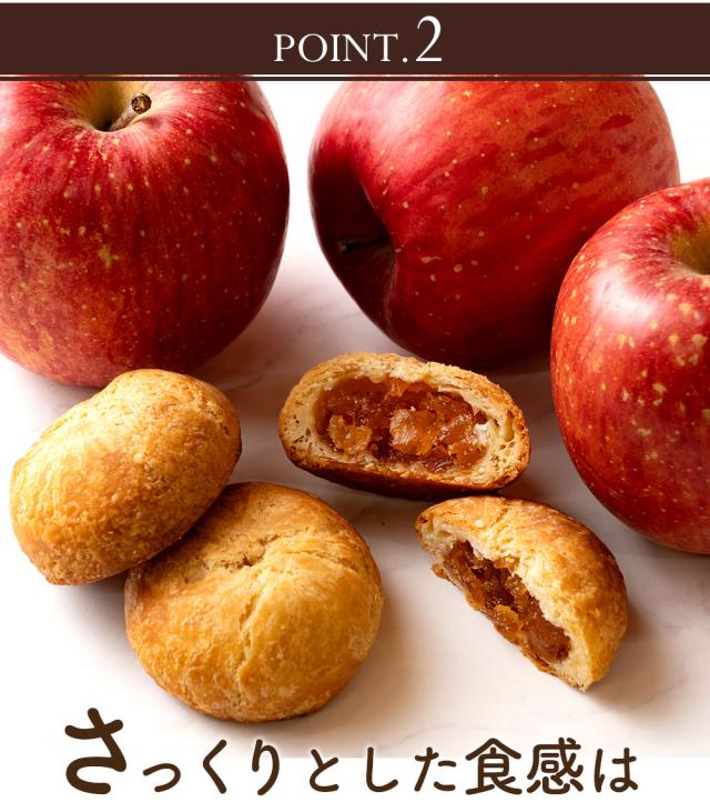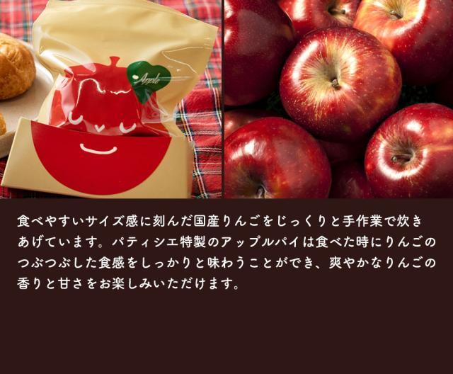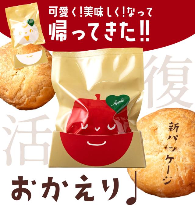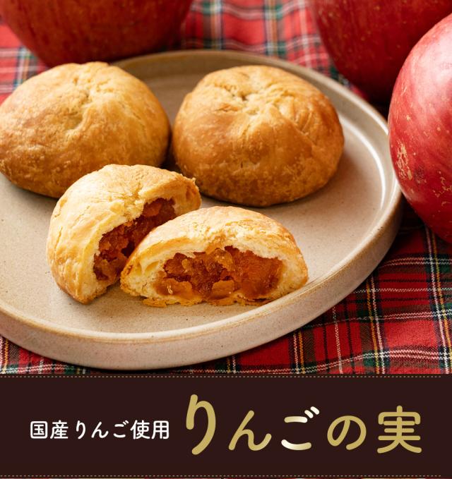 りんご(国産)、小麦粉(国内製造)、マーガリン、砂糖、卵、水飴、調整脂、麦芽エキス、食塩/クエン酸、乳化剤、香料、酸化防止剤(V.C、V.E)、乳酸Ca、着色料(カロテン)、(一部に小麦・卵・乳成分・大豆・りんごを含む)