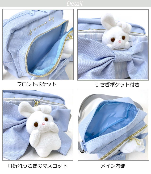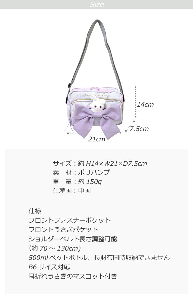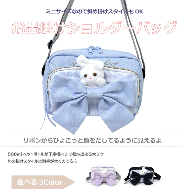 ![]() ![]() ![]() ![]() ![]() ・anilet+ アニレット ひょこぬいリボン フロントの大きなリボンから顔を出すうさちゃんがかわいいショルダーバッグ。 ヨコ型で使いやすくなっています。 B6サイズ収納対応。500mlペットボトルが収納可能サイズです。 お誕生日・クリスマスプレゼントにもおすすめ。