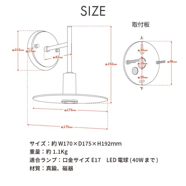 | 仕様 | 口金:E17 定格電圧:100V 対応電球:LED電球専用(40Wまで) 取り付け方法:壁付け ※壁付け専用照明器具です(埋め込み配線)。取付けは必ず電気工事店にご依頼ください。 ※照明器具にはスイッチは付いておりません。壁スイッチをご使用ください。 ※電球は付属しておりません。 |