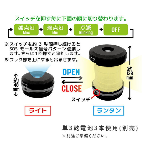 | 本体サイズ | ランタンライト:(収納時)幅8.5×奥行8.6×高さ4.8cm 給水タンク:外寸42×45cm 携帯トイレセット:(使用時サイズ)幅31×奥行27×高さ31cm |