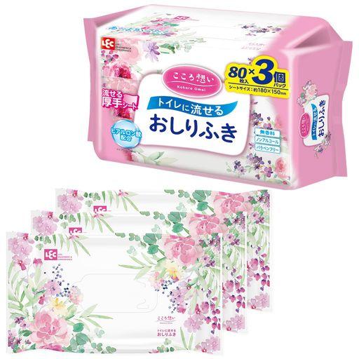 レック(LEC) こころ想い 大人用 トイレに流せる おしりふき 80枚×3P / 丈夫なシートでしっかり拭ける/日本製/無香料/ヒアルロン酸配合