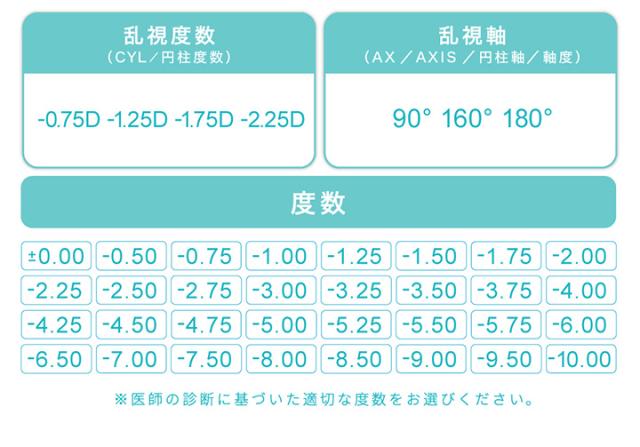 【乱視度数(CYL/円柱度数)】-0.75D、-1.25D、-1.75D、-2.25D