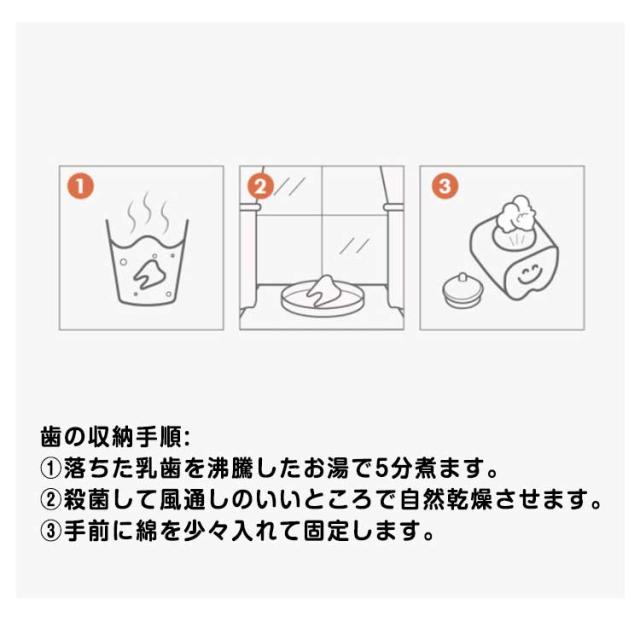 | お子様の成長の記録を大切に保管できる乳歯ケース。 可愛くて温かみのある質感です。 プレゼントとしても喜ばれます。 歯の収納手順: 1.落ちた乳歯を沸騰したお湯で5分煮ます。 2.殺菌して風通しのいいところで自然乾燥させます。 3.手前に綿を少々入れて固定します。 | |