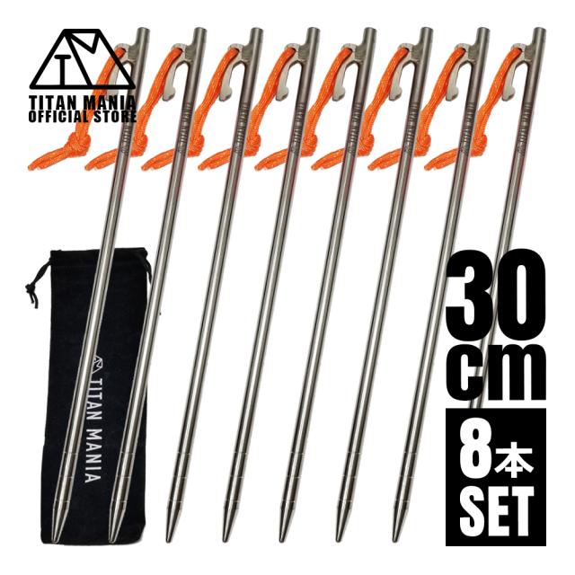 TITAN MANIA チタンマニア ペグ チタン製 チタンペグ ソリッド 超軽量 強靭 30cm 8本セット 山地 砂利 草地 硬い地面 テントペグ キャンプ 設営用具 収納袋付き