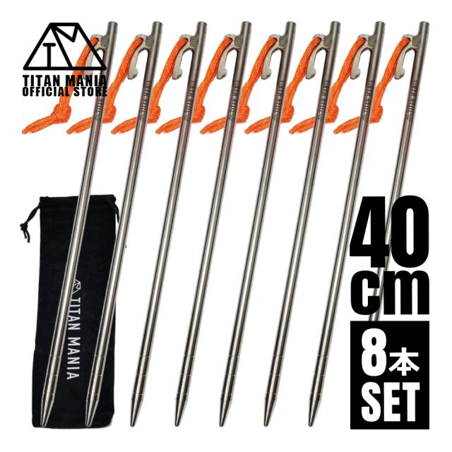 TITAN MANIA チタンマニア ペグ チタン製 チタンペグ ソリッド 超軽量 強靭 40cm 8本セット 山地 砂利 草地 硬い地面 テントペグ キャンプ 設営用具 収納袋付き